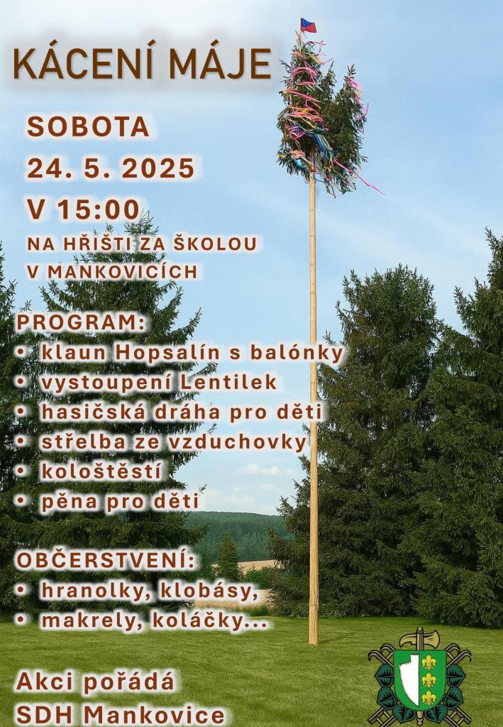 Sbor dobrovolných hasičů Mankovice pořádá v sobotu 24.5.2025 v 15.00 hodin „Kácení máje“ na hřišti za školou v Mankovicích.