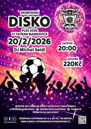 TJ Tatran Mankovice srdečně zve na SPORTOVNÍ DISKO PLES 2026, který se uskuteční v pátek 20.2.2026 od 20 hodin v Kulturním domě Mankovice. Vstupné je 220 korun. Večer plný tance, zábavy a příjemné atmosféry. Připraveno bohaté občerstvení a tombola o hodnotné ceny. Televize, elektrokoloběžka a další.