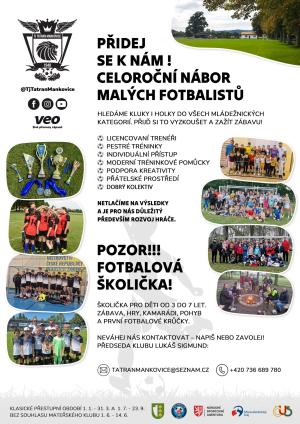 TJ Tatran Mankovice pořádá TATRAN CUP 2025 Turnaj v malé kopané v sobotu 19. července 2025 od 10:00 na fotbalovém hřišti TJ Tatran Mankovice. Přihlášky do čtvrtku 17. 7. 2025 na tatranmankovice@seznam.cz