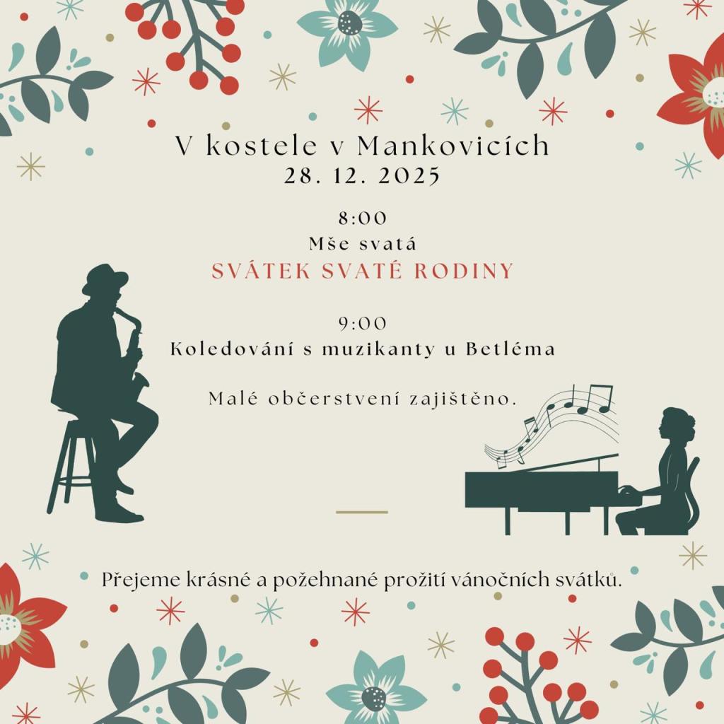 Farnost Mankovice vás zve v neděli 28.12.2025 do Kostela Navštívení Panny Marie, a to na Mši svatou – Svátek svaté rodiny od 8.00 hodin a od 9.00 hodin na Koledování s muzikanty u Betléma.
