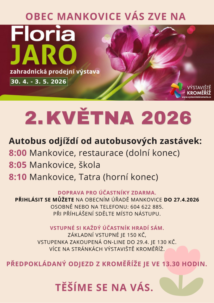 Obec Mankovice vás zve na zájezd do Kroměříže na Výstaviště FLORIA JARO 2026. Na zahradnickou prodejní výstavu vyrazíme v sobotu 2.5.2026. Autobus odjíždí od autobusových zastávek. V 8.00 od zastávky Mankovice, restaurace z dolního konce, v 8.05 ze zastávky Mankovice, škola a v 8.10 hodin ze zastávky Mankovice, Tatra z horního konce. Doprava je pro účastníky zdarma, vstupné si na místě platí každý účastník sám. Přihlásit se můžete osobně nebo telefonicky na čísle 604 622 885, a to nejpozději během dneška do 17.00 hodin.
